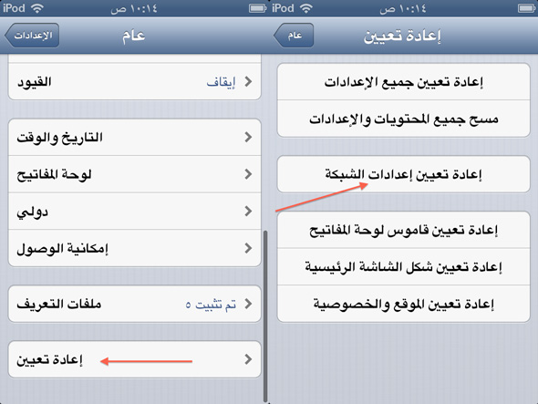 - الثاني: إعادة التعيين لإعدادات الشبكة وهذا سوف يمسح جميع الشبكات المسجلة وعليك تسجيل الدخول مرة أخرى في الشبكات التي تستخدمها ويمكنك ذلك من الإعدادات ثم عام ثم إعادة التعيين ثم إعادة تعيين إعدادات الشبكة: