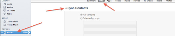 - إذا كانت الأسماء موجودة على حاسبك فيمكنك عمل مزامنة مع جهازك باستخدام الآي تونز وذلك باختيار جهازك ثم من الإختيارات في أعلى تختار info ثم Sync Contacts ( لكي تعمل هذه الطريقة لابد من ألا تكون المزامنة مع السحابة فعالة حالياً )
