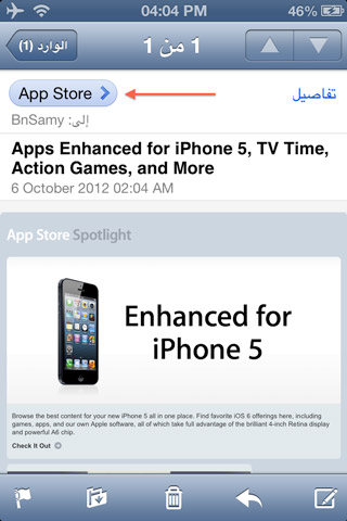 الطريقة السابقة مفيدة لإضافة الأشخاص المسجلين في قائمة الأسماء لديك إلى قائمة الـ VIP لكن أحياناً تأتينا رسائل هامة من أحد المتاجر أو موقع يقدم تخفيضات وعروض أو حتى من شركة أبل نفسها، وغير المعتاد أن يقوم أحدنا بتسجيل بريد الشركات في جهازه وخاصة أنه لن يرسل إليهم بل يستقبل منهم فقط، لإضافة أي بريد في قائمة VIP قم بفتح الإيميل الوارد إليك وليكن من AppStore كما في الصورة التالية واضغط على اسم المرسل:
