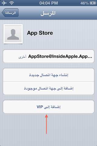 سيظهر لك صفحة تحتوي على البريد مع إمكانية إضافة هذا البريد إلى قائمة الأسماء، والأهم من ذلك إمكانية الإضافة المباشرة إلى VIP بدون الحاجة إلى حفظ هذا الإيميل في جهازك: