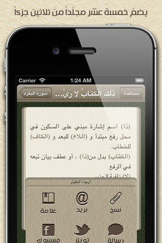 تطبيق إعراب القران الكريم يساعدنا على فهم القرآن بالصورة الأنسب وكذلك تطوير مهاراتنا النحوية في اللغة العربية الأصيلة التي هى لغة القرآن الكريم، كما يحتوي التطبيق على أقسام لإعراب الآيات وإظهار الصور البلاغية فيها لنرى إعجاز اللغة في القرآن الكريم والبلاغة الكبيرة فيها، إضافةً إلى التصريف والقواعد الصرفية في تلك الآيات، هذا التطبيق يعد من أكبر موسوعات إعراب القرآن الكريم حيث يضم خمسة عشر مجلّداً. وهو يتميز ببساطة التعامل معه ومقسم إلى ثلاثة أقسام هى البلاغة والصرف والإعراب ويضم عدد ضخم من المعلومات ويمكنك مشاركة المعلومات عن طريق تويتر والفيس بوك والإيميل والرسائل التصية أيضاً، كما تستطيع وضع علامات على المعلومات لتعود إليها لاحقاً.
