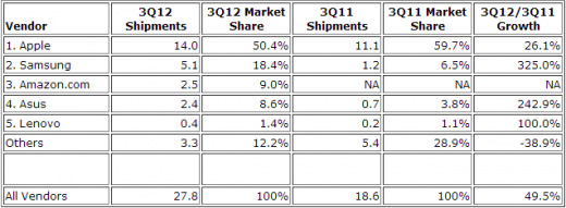 ينمو سوق الاجهزة اللوحية بنسبة تقترب من الـ 50% سنوياً لكن التوزيع يتغير، فبفضل سامسونج وأمازون زادت حصة “أندرويد” في الربع الحالي بنسبة تصل الى 6.7% اذا ما قورنت بحصتها المسجلة في الربع الأول من نفس العام، وجاءت الزيادة على حساب الآي باد، أبل خسرت 9.3% من حصتها فقط ما بين الربع الثالث والربع الأخير من العام الحالي والنسبة تصل الي 15.1% حين تقارن بحصتها من السوق في الربع الثاني من نفس العام، أبل تراجعت نسبتها بشكل ملحوظ وسريع حيث عززت الشركات الخمسة الكبرى موقفها بأجهزة جديدة لكن أبل تبقى في الصدارة بنسبة تتعدى الـ50%، الشركات الخمسة هم أبل، سامسونج، أمازون، آسوس، و لينوفو.