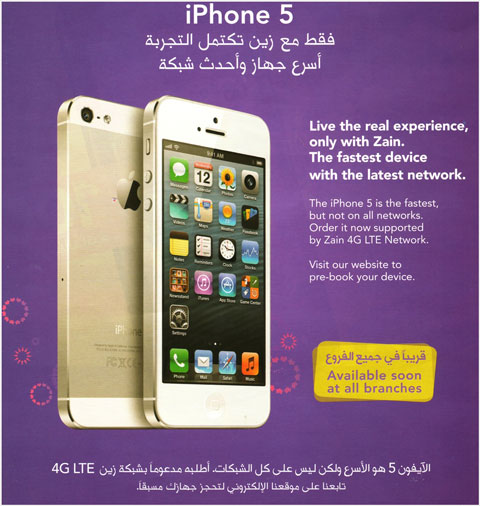 يعد الدعم لشبكات الجيل الرابع أحد أوجه المقارنة بين الأجهزة المحمولة كلها، ومن المعروف أن ليست كل شركات الاتصال مستعدة لدعم هذه الشبكات عالية السرعة، ومؤخراً أصدرت شركة “زين” نشرة بآخر العروض من الشركة وتضمنت أنهم يستعدون لإطلاق الآي فون 5 رسمياً في المملكة العربية السعودية وأنه سوف يكون مختلفاً بسرعة ال 4G، من المتوقع أن يكون الآي فون 5 متوفراً من شركات الاتصالات السعودية (زين و الاتصالات السعودية و موبايلي) في الأسابيع القادمة، الجدير بالذكر أن شبكة الجيل الرابع من زين 1800Mhz هى الوحيدة المتوافقة مع الآي فون 5 في السعودية في الوقت الحالي.