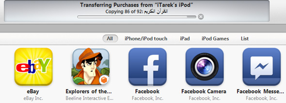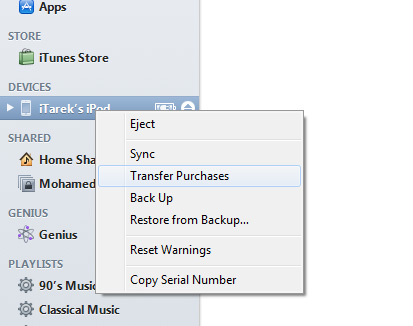 قم بالنقر على زر الفأرة الأيمن على اسم الجهاز ثم اختيار “Transfer Purchases” وهى ستقوم بنقل التطبيقات، وإذا سألك على كلمة المرور فقم بكتابتها: