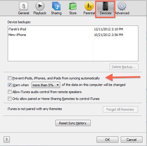 من الأمور التي تزعج المستخدمين هى المزامنة التلقائية فكلما قام المستخدم بتوصيل جهازه بالآي تونز فهو يقوم بالمزامنة وإضافة تطبيقات وحذفها، فإذا كانت المزامنة التلقائي تضايقك فيمكن إلغاءها بالخطوات التالية: