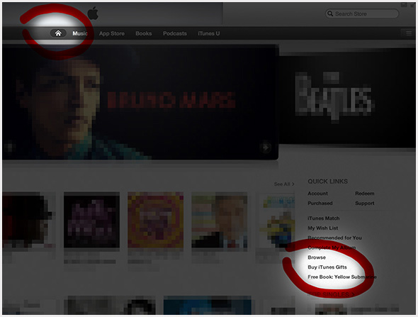 افتح تطبيق الآي تونز وفي الصفحة الرئيسية ستجد Buy iTunes Gifts كالتالي: