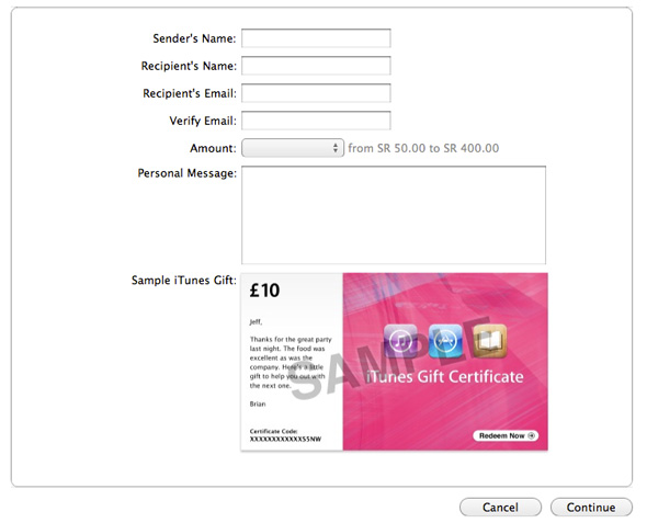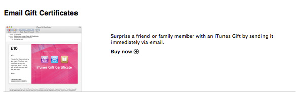 كارت إلكتروني: Email Gift Certificates وهذا الخيار يمكنك من إرسال كارت آي تونز هدية لصديق ويصله كإيميل: