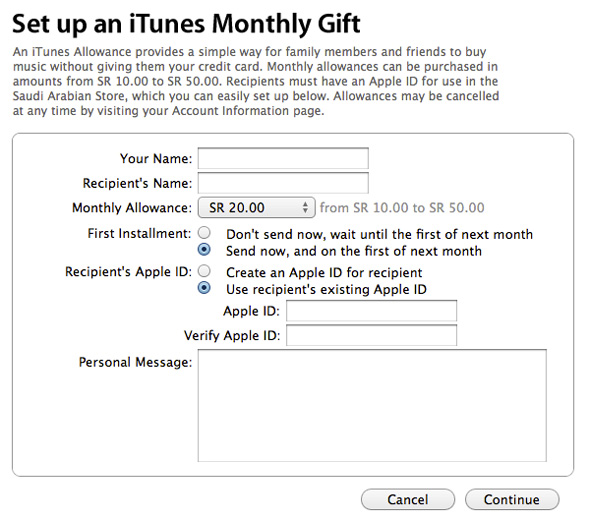 يمكنك اختيار مبلغ يتراوح بين 10 إلى 50 ريال/درهم وسوف يخصم كل شهر من رصيدك ويمنح للشخص الذي تختاره ويمكن لهذا الشخص شراء ما يشاء من التطبيقات، فقط قم بكتابة اسمك واسم المستلم واختر هل تريد ارسال المبلغ من الآن أم من بداية الشهر التالي ثم اكتب حساب أبل الخاص بالمستلم وكذلك رسالة شخصية منك له ثم ارسل الكارت