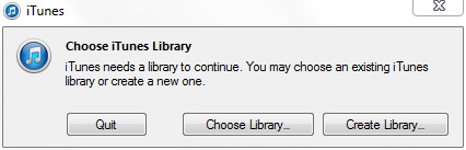 لتنشئ مكتبة خاصة بك اضغط على زر”Shift” في لوحة المفاتيح إن كنت تستخدم على حاسبك نظام ويندوز أو زر “Option” ، “Alt” في نظام الـ Mac ثم اضغط على أيقونة الآي تيونز دون أن تترك الزر. وعندها ستُفتح أمامك نافذة جديدة بها ثلاثة اختيارات (Quit, Choose library, Create library) كالتالي:
