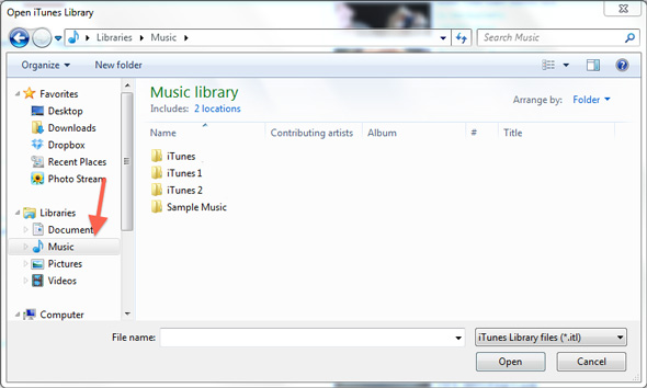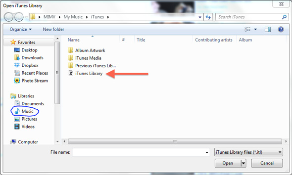 اختر المكتبه الخاصة بك ومن المجلد الخاص بها اختر الملف الذي باسم ” iTunes library “.