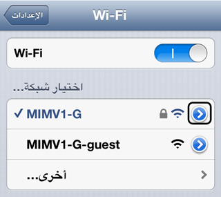 اذهب إلى الإعدادات ثم Wi-Fi وقم بالضغط على السهم الأزرق يمين شبكة الواي فاي الحالية:
