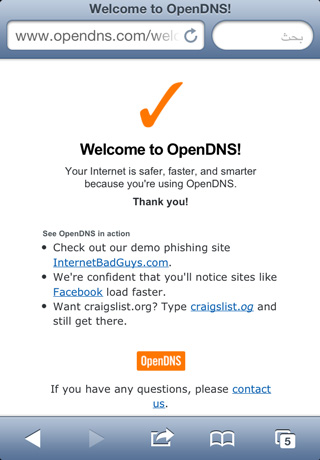 قم بإغلاق جهازك ثم أعد فتحه مرة أخرى وسوف تجد المواقع الجنسية محجوبة بغض النظر عن فتحها بأي متصفح في الجهاز ( أحياناً تحتاج إلى بعض الوقت لتعمل). ويمكن التأكد من أن الإعدادات تم وضعها بشكل صحيح وذلك بالذهاب إلى موقع http://opendns.com/welcome عبر هذا الرابط من الجهاز وسيظهر لك الشكل التالي ليؤكد عمل الإعدادات بشكل صحيح: