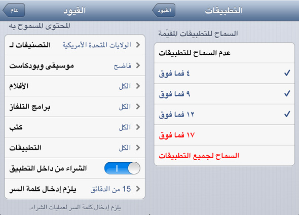 تحديد أي فئة تطبيقات أو كتب أو صوتيات وأفلام مسموح بها، كما أشرنا سابقاً.