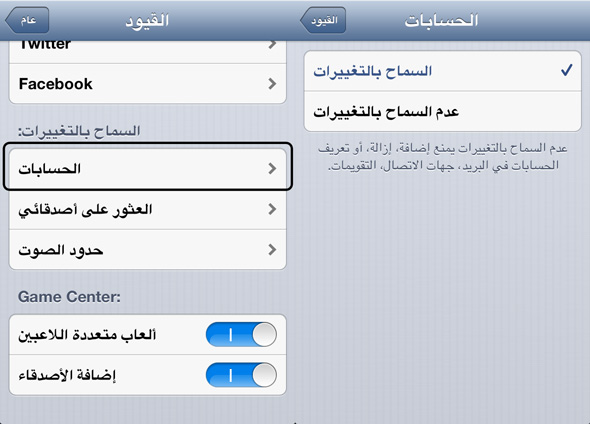 كما أضافت أبل ميزة جديدة في iOS 6 وهى منع تسجيل خروج من المتجرأو إضافة بريد وغيرهم، وبهذا لن يستطيع ابنك أن يسجل خروج من الحساب الذي وضعته أنت في الجهاز وستستطيع معرفة التطبيقات التي قام بتحميلها.