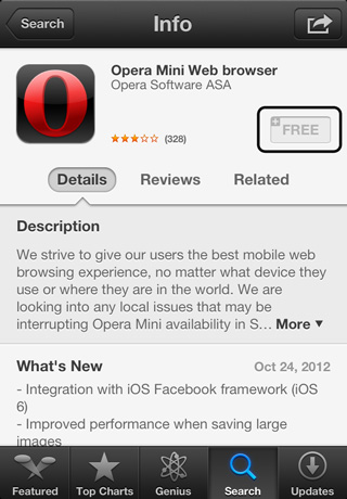 - إذا قمت بتفعيل منع التطبيقات +17 وذهبت إلى متجر البرامج وقمت بالبحث عن تطبيق+17 مثل أوبرا فسيظهر التطبيق بدون صور وأيضاً ستجد زر التحميل مطفئ كالتالي: