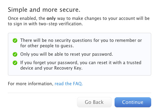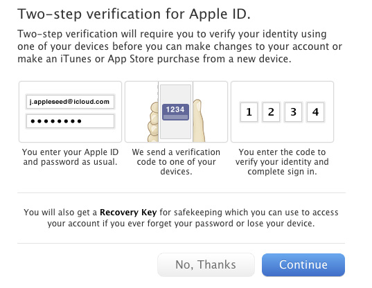 الطريقة الجديدة ستلغي الأسئلة السرية لك وسيكون بديلاً لها جهاز آخر موثق، فمثلاً تقوم بشراء التطبيقات دائماً من الآي فون، ثم حصلت على آي باد وأردت شراء تطبيقات منه فسيظهر لك على شاشة الآي فون (الجهاز الموثق الذي تستخدمه في الشراء) رقم وعليك إدخال الرقم هذا في الآي باد (الجهاز الجديد الذي ترغب في الشراء منه) لكي تتم عملية الشراء. وبهذا لن يستطيع أحد أبداً شراء التطبيقات بدون معرفة الرقم الذي سيظهر على شاشة الجهاز الموثق.