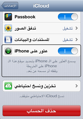 - لابد من أن تكون خدمة “العثور على الهاتف” من السحابة مفعلة وإلا لن يظهر الجهاز ولتفعيلها إذهب إلى الإعدادات ثم iCloud وفعلها.