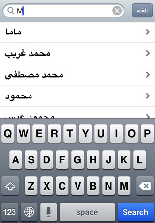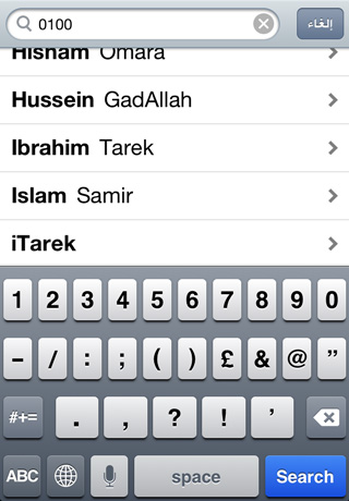 ميزة جديدة في iOS 6 وهى إمكانية البحث في الأسماء العربية بالحروف الإنجليزية، فمثلاً إذا ذهبت إلى قائمة الأسماء ستجد في أعلى البحث، قبل iOS 6 كان فقط البحث يتم بالأسماء المسجلة، لكن الآن يمكنك البحث بكتابة أي جزء من رقم سيظهر لك نتائج بحث