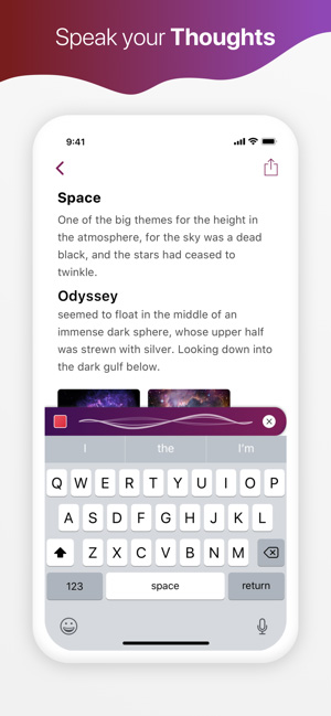 ربما قد راودتك فكرة القيام بتسجيل ملاحظاتك حول موضوع ما أكثر من مرة ولكن التكاسل عن الكتابة المطولة هو ما يوقفك، هذا التطبيق متخصص في كتابة الملاحظات الصوتية إن كنت ترغب بتسجيل ملاحظة ما كل ما عليك القيام به هو التكلم و سيتم كتابة كل ما تقوله التطبيق يعتمد على خدمة Google Speech لذا دقته عالية بتتبع الكلام وأفضل بكثير من نفس الخاصية في تطبيقات آبل. يحتوي التطبيق ايضا على ادوات قوية لتحرير النصوص و الكتابة كما انه يدعم ملفات ال pdf و txt و image و html و يتم ايضا رفع كل ملاحظاتك على سحابة ال iCloud لتحتفظ بها في جميع أجهزتك.