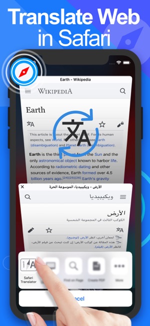 ربما احد اكثر المميزات التي يفتقر لها مستخدمو متصفح سفاري هي ترجمة مواقع الويب داخل المتصفح الميزة موجودة داخل متصفح كروم و هذا التطبيق يقوم بجلبها لمتصفح سفاري. بعد تحميل التطبيق عليك أن تقوم بتحديد اللغة داخل التطبيق بعد ذلك ان اردت ترجمة موقع ما داخل سفاري اضغط على زر المشاركة و اختر ترجمة و سيتم ترجمة الصفحة كاملة وفوريا.