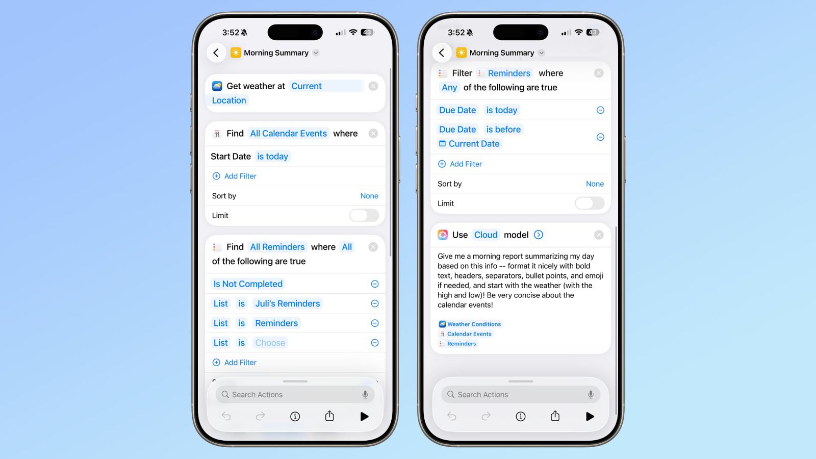 على سبيل المثال، يمكنك إنشاء اختصار يجمع بيانات الطقس والتقويم اليومي، ثم تطلب من النموذج تلخيصها في رسالة ترسلها إلى بريدك الإلكتروني.