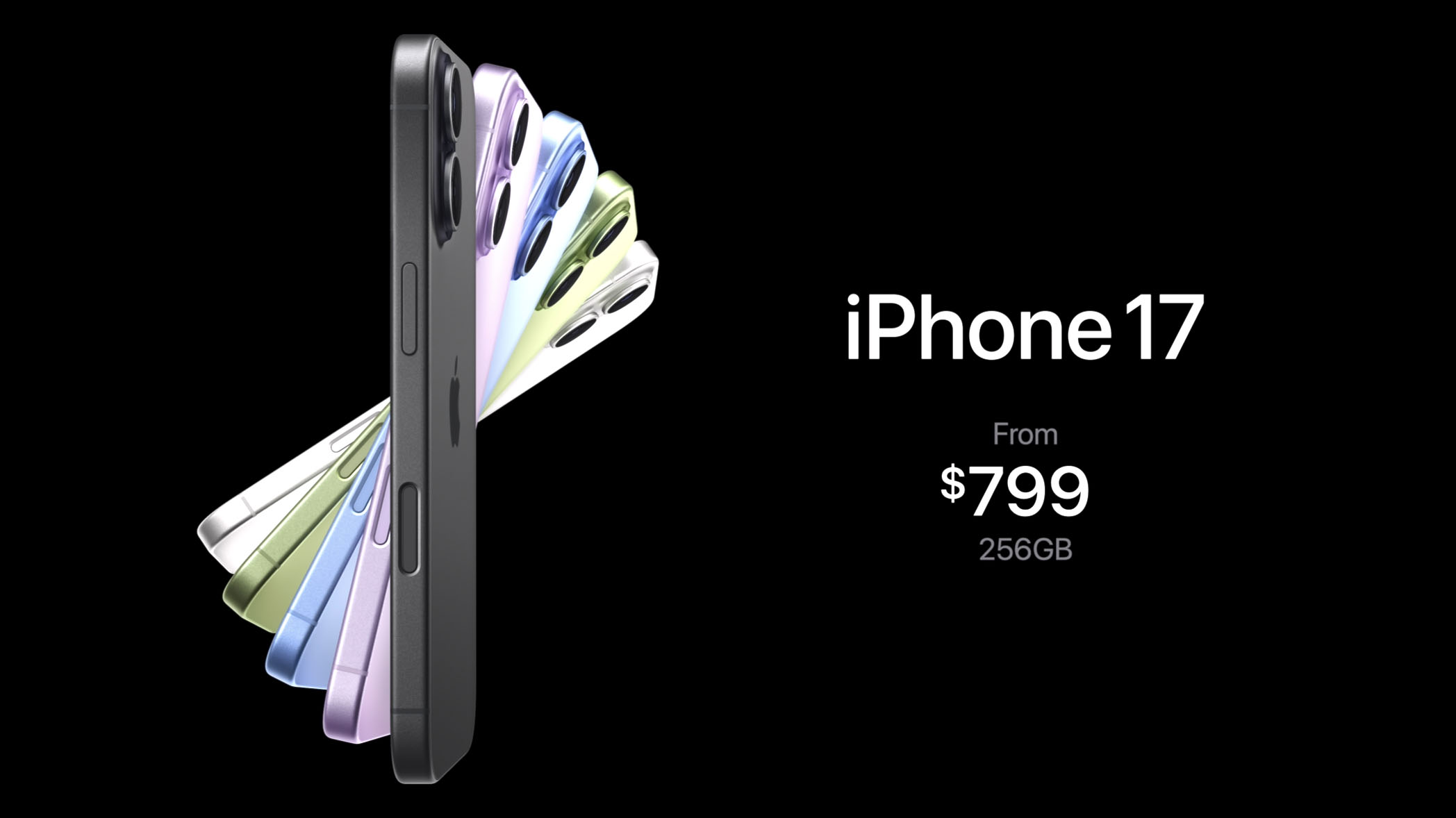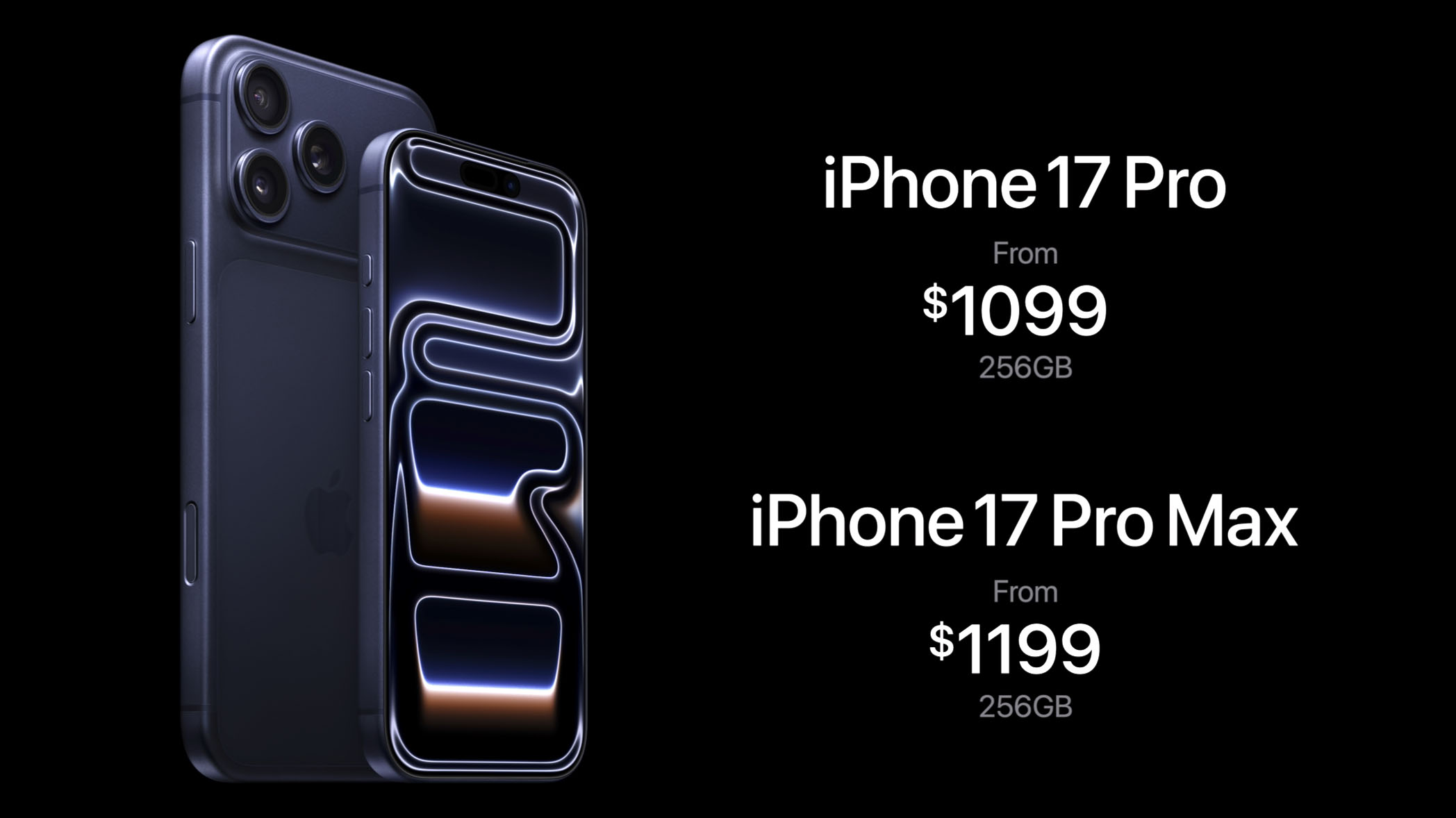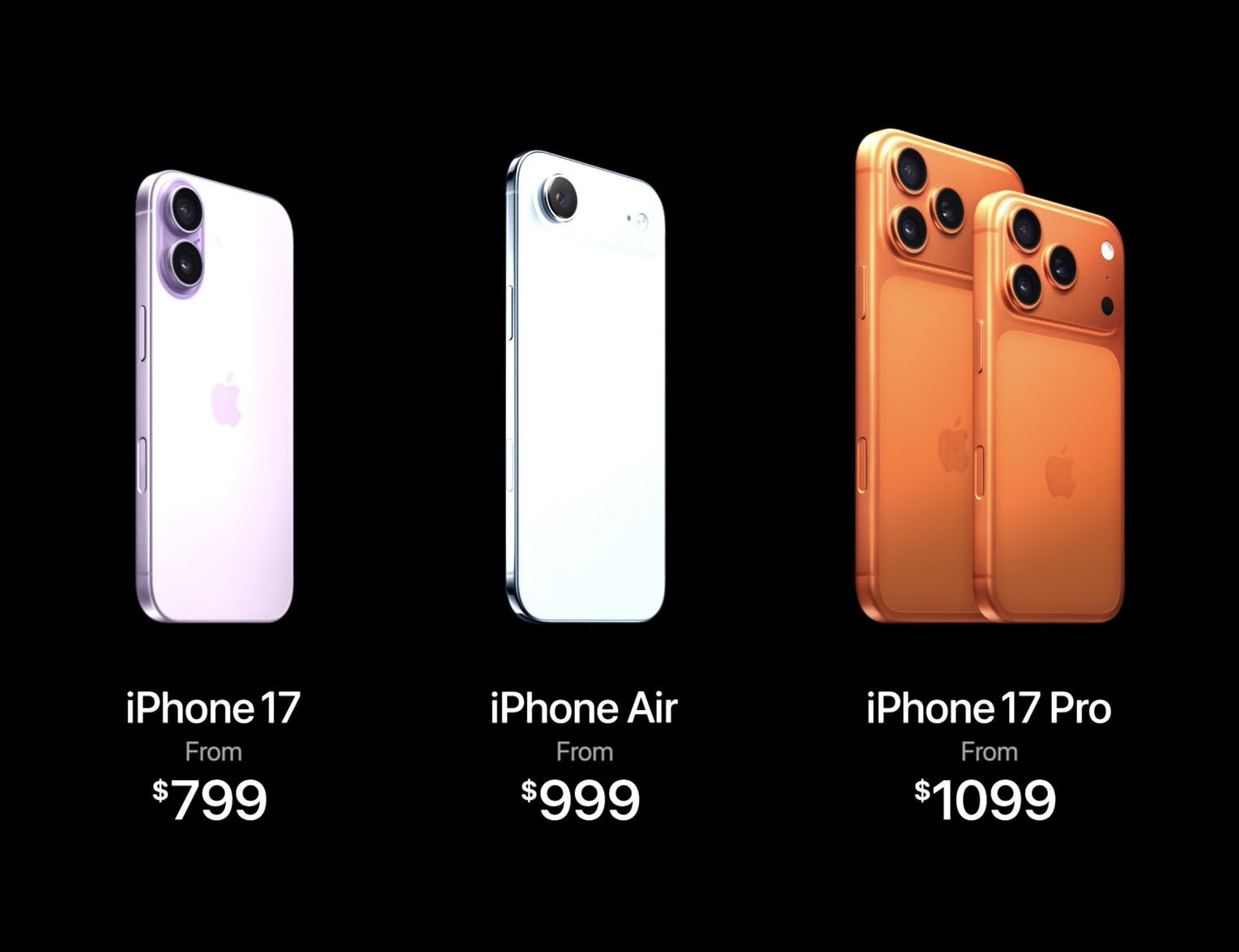أما الأسعار، فيبدأ آي-فون 16e من 599 دولارًا، بينما يبدأ آي-فون 17 من 799 دولارًا. أما آي-فون Air فسعره 999 دولارًا، وآي-فون 17 برو يبدأ من 1099 دولارًا، في حين يأتي آي-فون 17 برو ماكس بسعر 1199 دولارًا مع خيار تخزين يصل إلى 2 تيرابايت. الطلب المسبق يبدأ الجمعة، والتوفر في 19 سبتمبر.