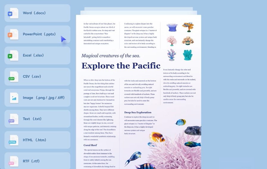 ◉ Meer manieren om PDF-bestanden te converteren. U kunt PDF-bestanden converteren naar op afbeeldingen gebaseerde PPT-presentaties voor naadloze presentaties, of meerdere pagina's combineren tot één lange afbeelding.